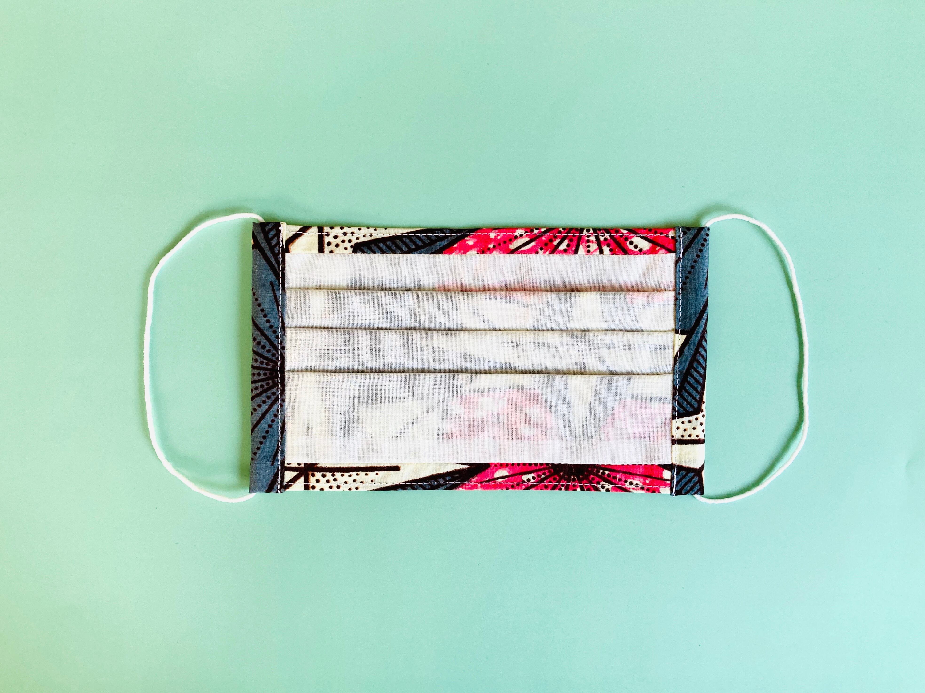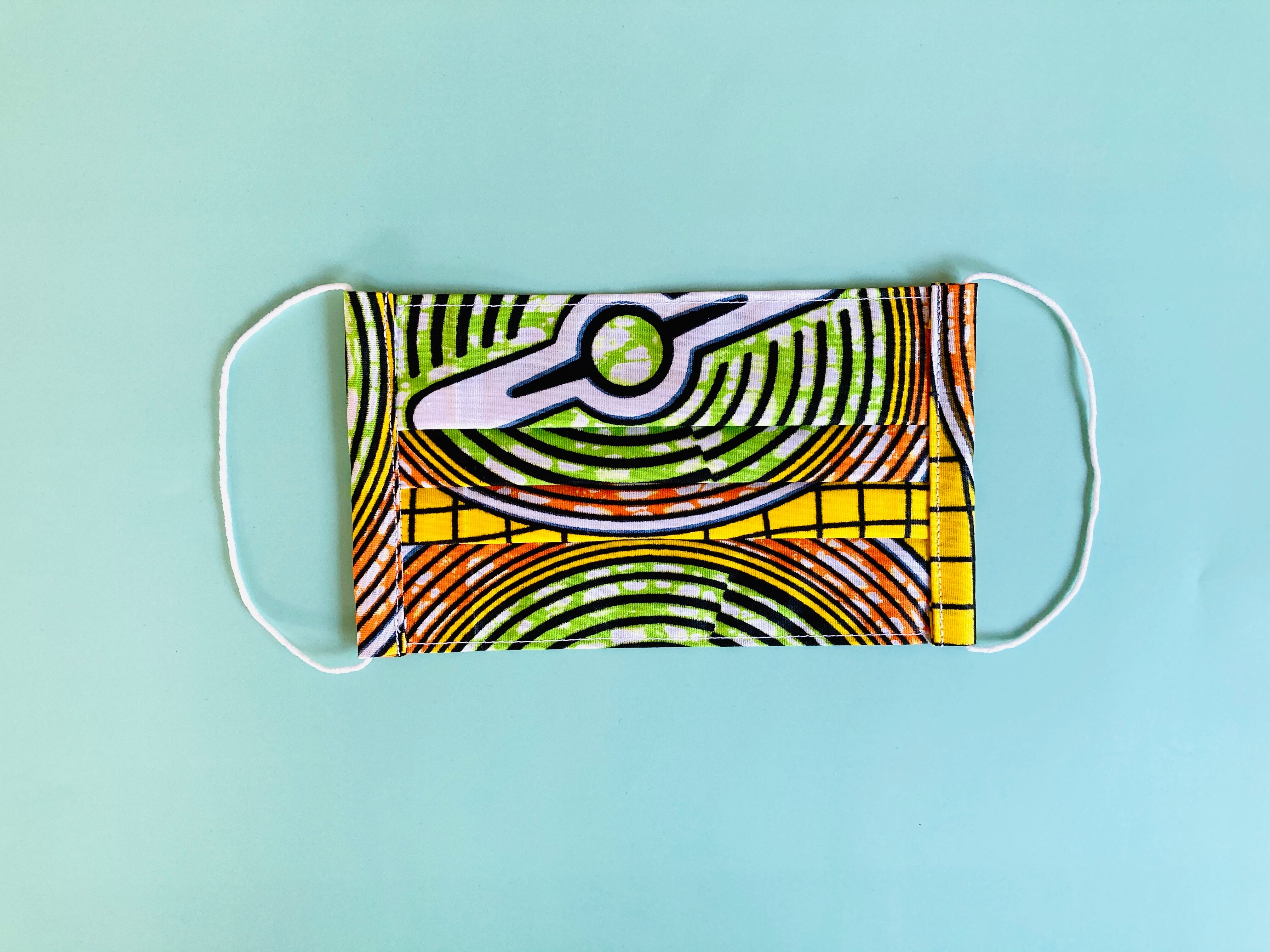 現地で買い付けた、アフリカ布をあしらったハンドメイドマスク。