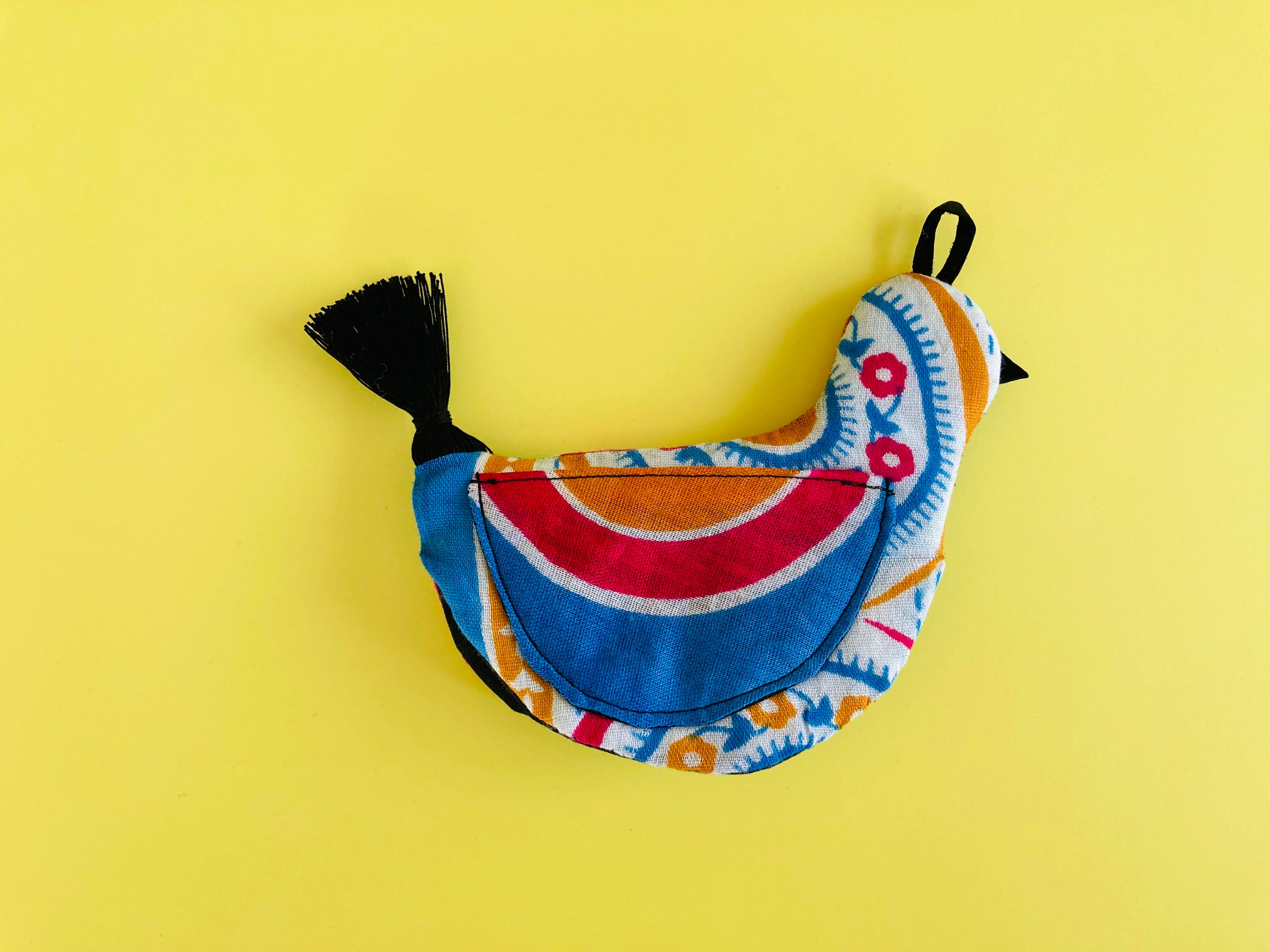 現地で買い付けたアフリカンファブリックをあしらったトリの鍋つかみ。